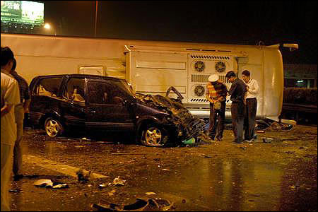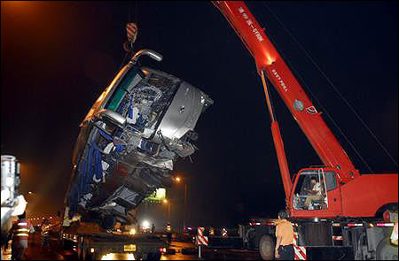 傷者被全部送走后,警察開始指揮吊車和清障車清理現(xiàn)場。晚9時(shí)50分,旅行車被吊上清障車拉走,晚10時(shí)15分,大客車被吊上另一輛大型清障車。記者晚上10時(shí)30分離開時(shí),警察還在對現(xiàn)場進(jìn)行勘查。